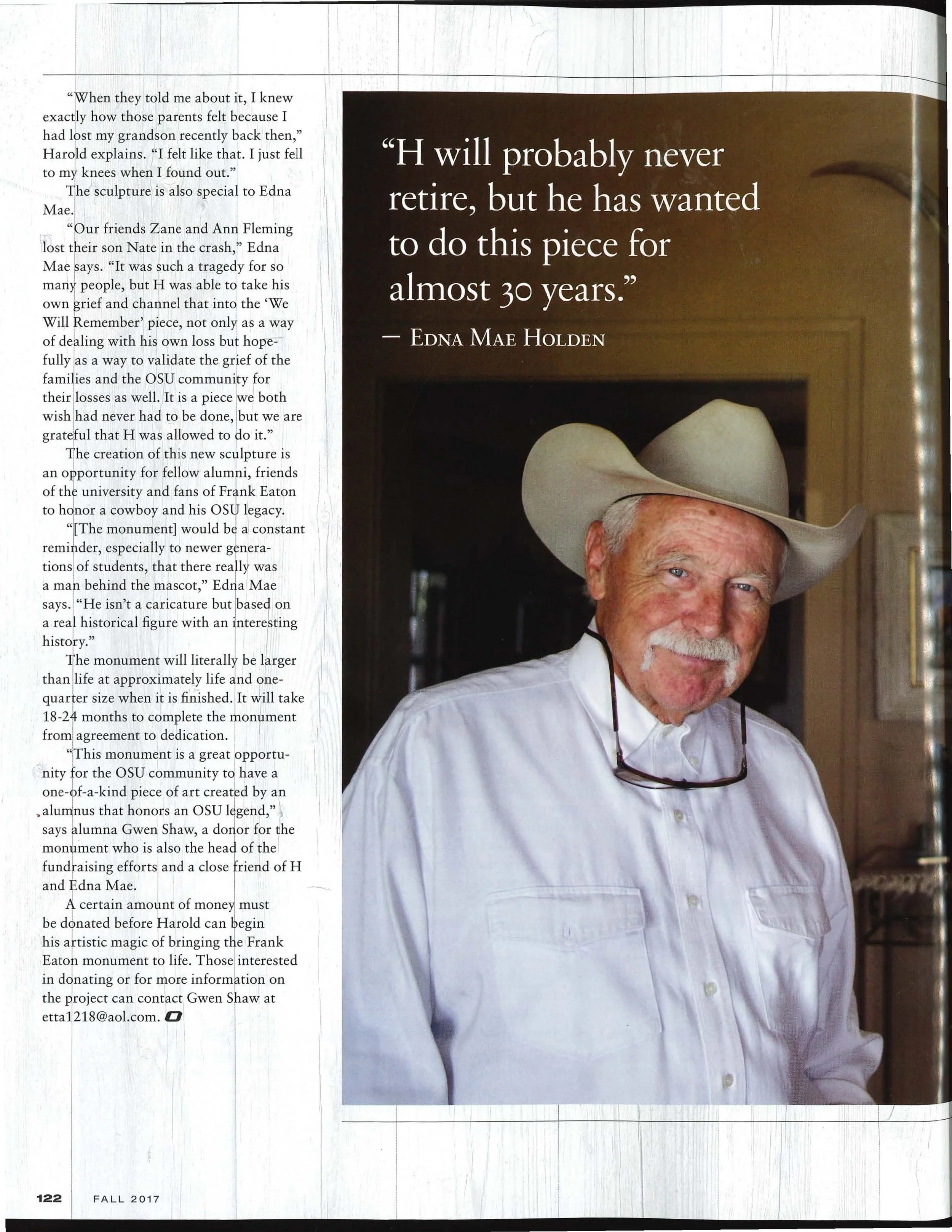 Harold T. “H” Holden’s story is one of grit, talent, and deep Oklahoma roots. From riding his pony in the Cherokee Strip Parade as a child to meeting the legendary Frank Eaton, Harold’s life has been intertwined with the cowboy spirit from the start. A self-taught sculptor and painter, he has spent more than 35 years capturing the essence of the American West through over 20 monumental works across Oklahoma, Texas, Kansas, and Arkansas. Despite facing health challenges, including a lung transplant, Harold’s passion never wavered. Honored as a Distinguished Alumnus by OSU in 2005 and chosen to create the “We Will Remember” monument at Gallagher-Iba Arena, his career is marked by humility, artistry, and a dedication to preserving Western heritage. This article reflects on his journey, his inspirations, and his enduring legacy as one of Oklahoma’s most beloved cowboy artists.