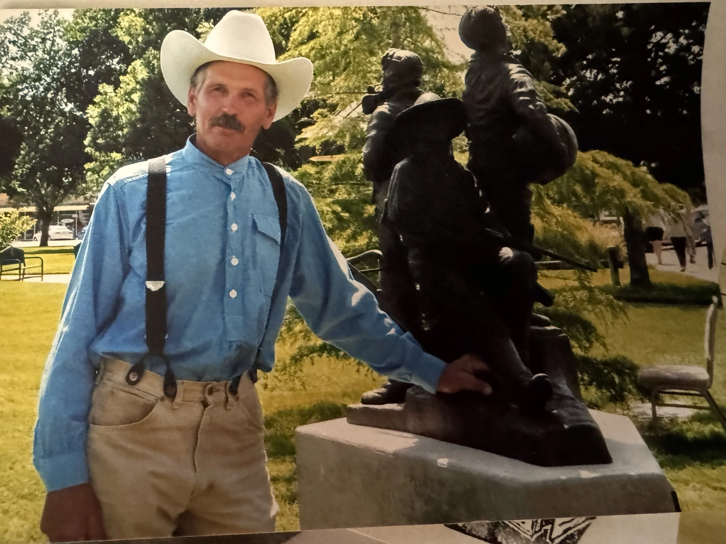 H met Pistol Pete when he was 5 years old. H rode his pony in the Cherokee Strip Days parade in Enid and when he got in front of the Judge's stand, he reared up his pony. For that, H won 1st place in the 10 and under division and part of the prize was getting to sit on Frank Eaton's lap and hold his gun. It made quite an impression on H. Sadly, H died before he finished this piece so his friends Paul Moore and John Rule came to H's studio, used H's tools and followed H's design to complete the monument. It was dedicated on September 6, 2024. The only thing missing that day was H.